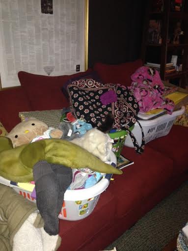 I’ve been piling everything on the couch. It’s easier because I don’t have to bend as much. This makes me sound elderly, but I’m just lazy. Also, this is my prime reading and tea-drinking spot, so I’m motivated to get rid of this crap so I can sit down.